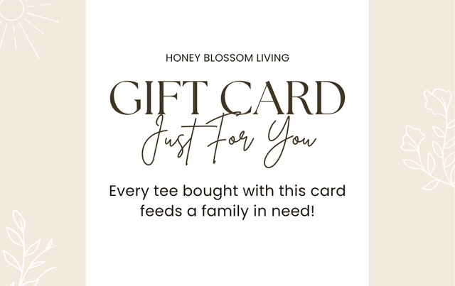 Let them pick their favorite! A Honey Blossom Living Gift Card is the easiest way to give tees that make a difference. Every purchase made with this card helps feed families in need.