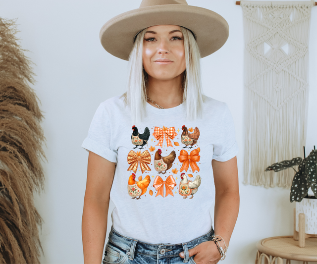 Autumn Chickens & Bows Tee - Athletic Heather / XS is backordered and will ship as soon as it is back in stock.